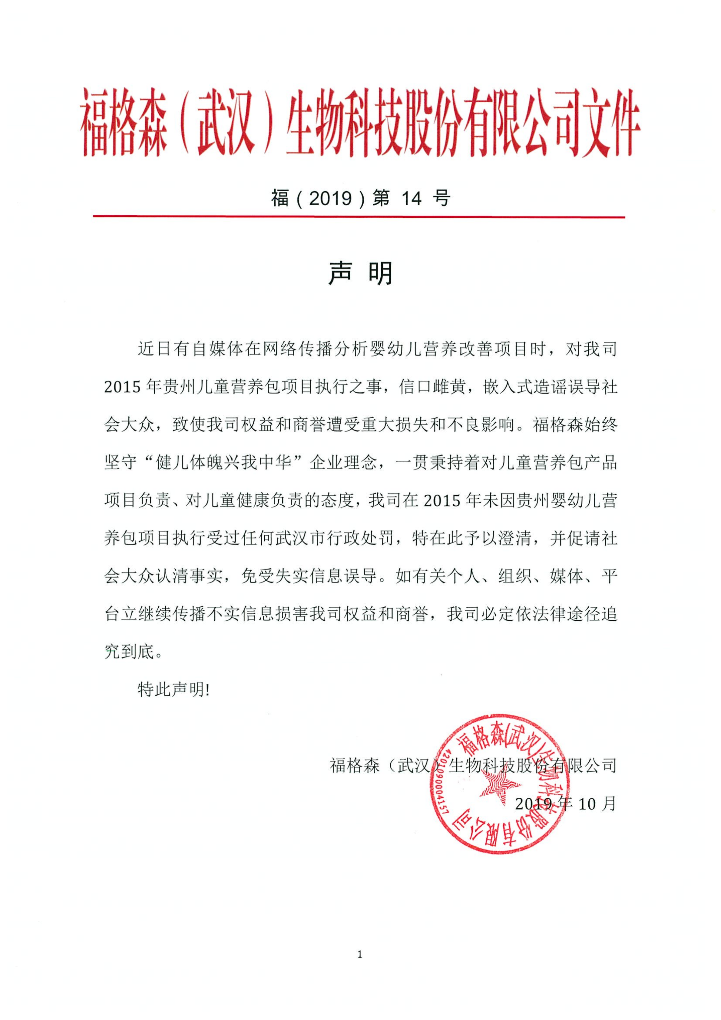 福格森(武漢)生物科技股份有限公司聲明函